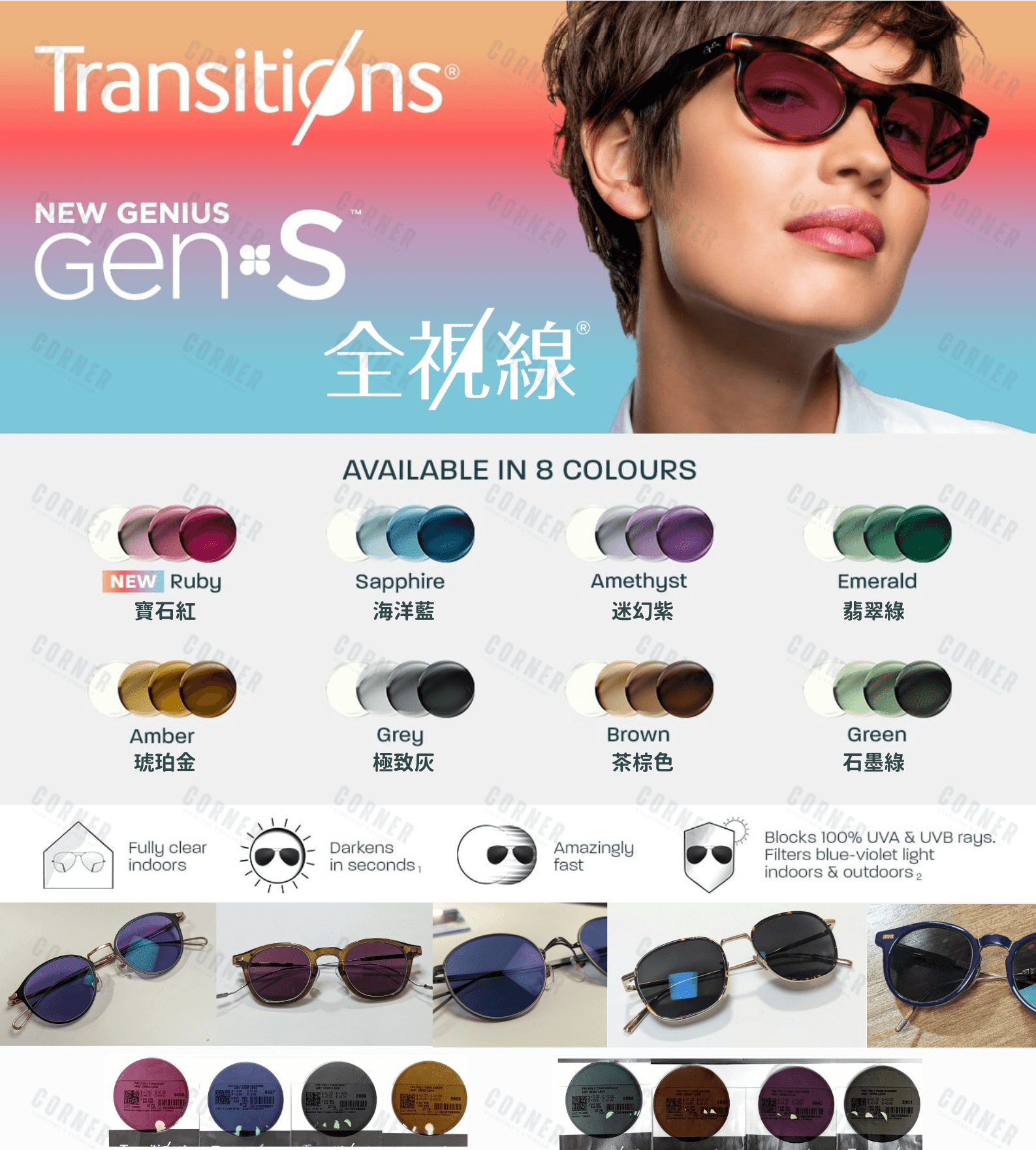 全視線 Transitions Gen S 具備超快速光變反應,室內完全透明,戶外數秒內變暗至深色調(達14%透光率),少於2分鐘快速恢復清晰;比上一代快達兩倍,提供100% UVA/UVB防護,室內過濾32%藍紫光、戶外85%,並提升39%強光恢復速度與39.5%對比敏感度,讓視覺在各種光線下更舒適清晰。