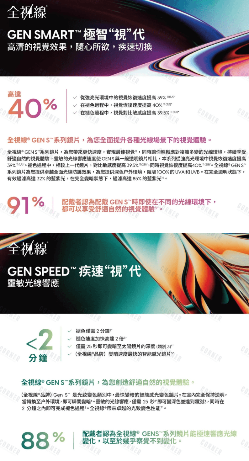 Gen S™ 具備智能變色功能,根據光線條件自動調節鏡片顏色深淺。提供39%更快的強光視覺恢復能力,對比敏感度提升39.5%,88%的使用者表示變色速度快到幾乎察覺不到變化。